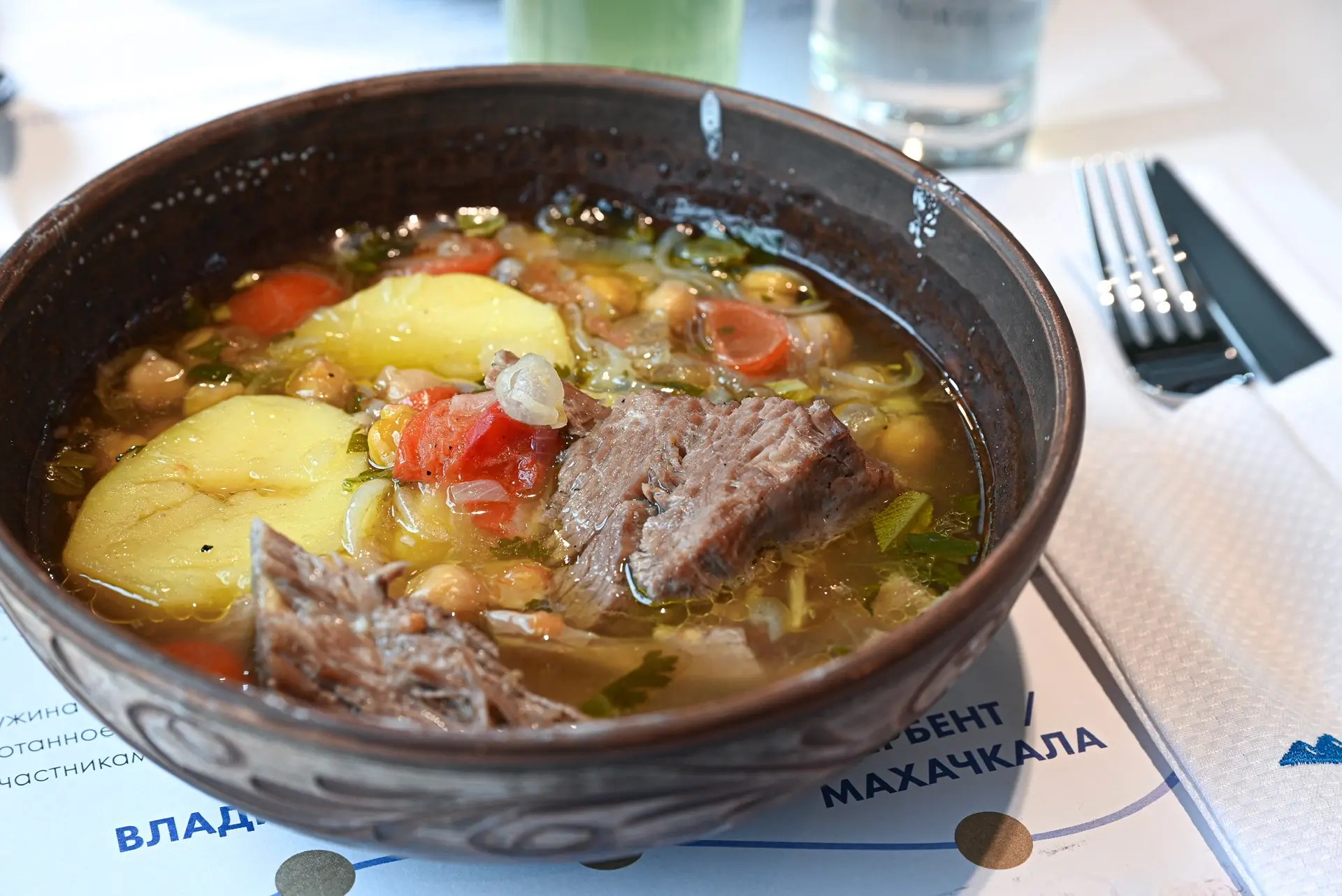 На первое пассажирам предлагают уху «Горскую» с кинзой и наваристый бозбаш из говядины с нутом. В этих блюдах бульон рассказывает историю региона не хуже экскурсовода – насыщенный, долгий, с характером.