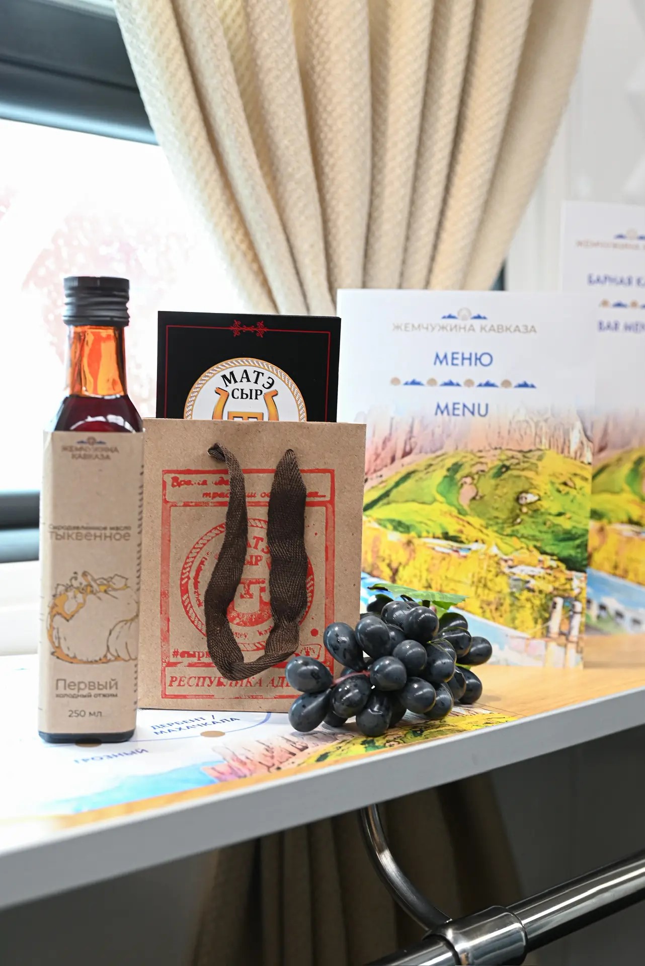 В вагоне-ресторане можно приобрести частичку Кавказа, чтобы увезти её с собой. Ассортимент гастрономических сувениров впечатляет: адыгейский сыр «МАТЭ», горный чай Осетии «Кавказский сбор», черкесские пряности, льняное и тыквенное масло из Чечни, орехи в меду, урбеч «Секреты Кавказа» из семян и орехов, а также шоколадные наборы «Привет из Осетии» и имбирные пряники «Жемчужина Кавказа».